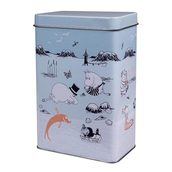 Martinex Mumin kaffeburk 20 cm Strandtur blå är en stilren plåtburk med ett avslappnat strandmotiv från Mumindalen. Den blå färgen och det somriga trycket gör den till en fin detalj i köket – oavsett årstid.