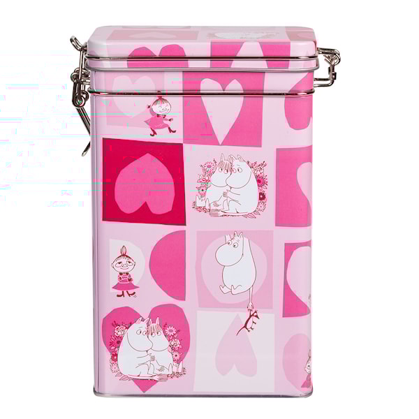 Mumin kaffeburk Älskad från Martinex är en vacker och praktisk plåtburk, dekorerad med ett kärleksfullt Muminmotiv i olika nyanser av rosa. Burken har ett tättslutande lock med spännlås som håller kaffet fräscht längre. Den rymmer ett avlångt 500 grams kaffepaket och är både funktionell och dekorativ i köket. För att bevara burkens fina design rekommenderas handdisk och noggrann torkning. En perfekt kombination av stil och funktion för alla som älskar Mumin och kaffe.