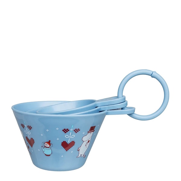Denna blå Mumin-måttsats i tre delar är både praktisk och dekorativ, perfekt för dig som vill ha en vintrig touch i köket. Setet består av tre storlekar – 0,5 dl, 1 dl och 2 dl – och pryds av ett vackert Mumin-motiv inspirerat av den stilla midvintern.