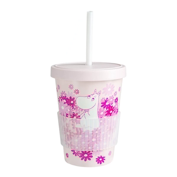 Martinex Mumin mugg med sugrör 45 cl Blomsterhjärta är en funktionell och söt drickmugg tillverkad i återvunnen plast. Med sitt rosa Muminmotiv och hjärtformade detaljer blir den ett glatt inslag vid varje dryckespaus.