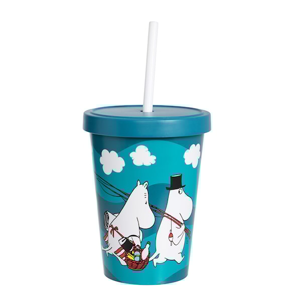 Mumin mugg med sugrör Gård från Martinex är en praktisk och lekfull mugg med ett härligt motiv av Muminfamiljen som återvänder hem till Muminhuset efter ett av sina äventyr. Tillverkad i återvunnen plast, rymmer denna mugg 45 cl och är perfekt för både kalla och varma drycker upp till 70°C. Muggen har ett praktiskt lock med sugrör, som är utrustat med en liten ring för att förhindra att sugröret faller ut. Tål maskindisk, vilket gör den smidig att använda och rengöra.