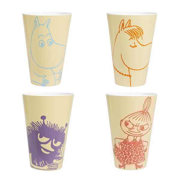 Martinex Mumin picknickmugg 45 cl 4-pack gul är ett praktiskt och charmigt set med fyra stapelbara muggar i slitstark återvunnen plast. De ljusgula muggarna är dekorerade med varsin Muminfigur – Mumintrollet, Lilla My, Snorkfröken och Stinky.