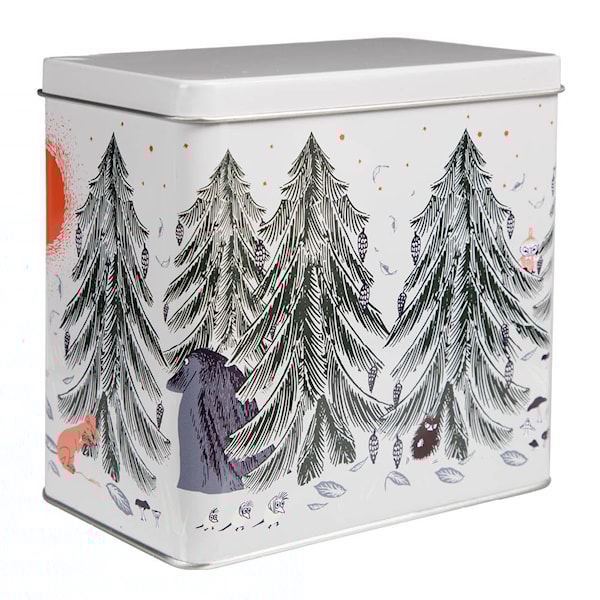 Denna avlånga plåtburk med härliga Muminmotiv kombinerar funktionalitet med en vacker design. Det charmiga motivet fångar en rofylld höstdag i skogen, där Mumintrollet och hans vänner njuter av naturens lugn. Burkens rektangulära form och stilrena uttryck gör den till en fin förvaringslösning i köket eller hemmet.