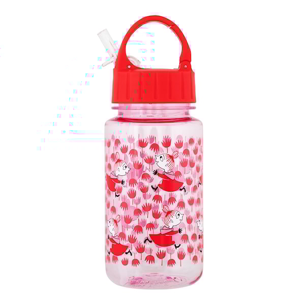 Mumin Vattenflaska med inbyggt sugrör från Martinex. Utsidan är helmönstrad med Lilla My som springer runt bland röda tulpaner och rymmer 35 cl. Handdisk rekommenderas.