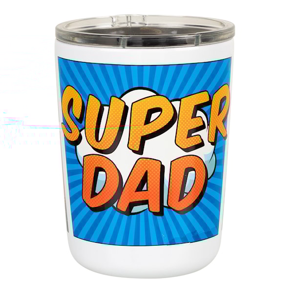 En färgglad termosmugg från Martinex. Motivet är tecknat i serieteckningsstil med texten 'Super Dad' på framsidan. Muggen är av rostfritt stål och locket PS-plast. Rymmer 39 cl. Håller drycken kall i 7 timmar och varm i några timmar. Handdisk rekommenderas.