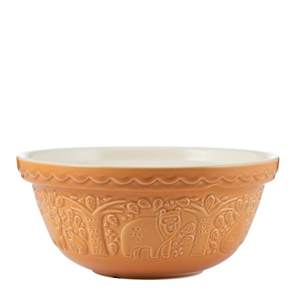 Mason Cash In The Forest blandningsskål S24, 2 L Björn, i ockrafärgad stengods är en del av en ikonisk serie där naturens berättelser möter praktiska köksbehov. Det djupa reliefmönstret föreställande en björn är både dekorativt och tidlöst.