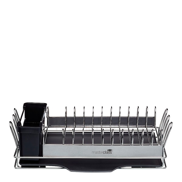 Diskstället har en lös bricka med dräneringshål och gummifötter, en löstagbar bestickhållare, och extra förvaring av knivar och andra längre redskap på sidan.