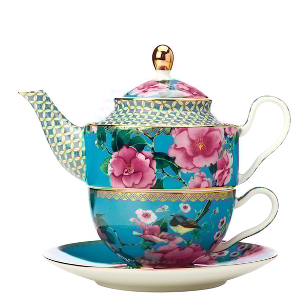 Setet inkluderar en porslinstekanna med matchande mugg och ett rostfritt stålfilter som gör det enkelt att brygga lösviktste. Den kompakta designen gör den idealisk för en person, medan den sofistikerade stilen gör den till ett dekorativt inslag i hemmet.