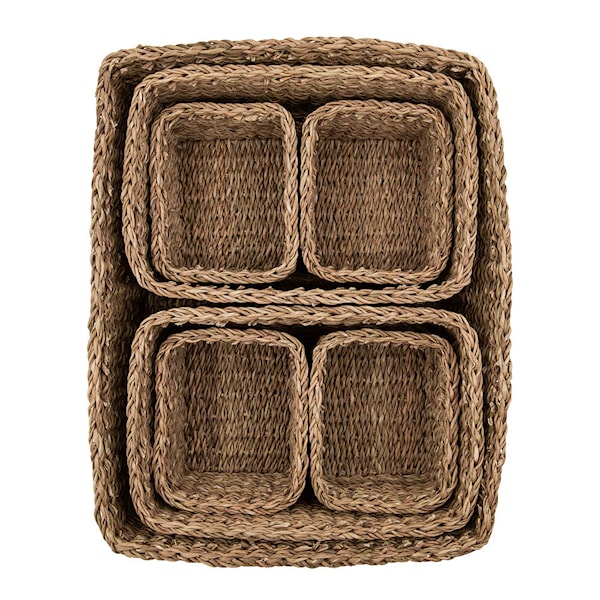 Förvaringskorgarna från Meraki kommer i ett set om sju och är tillverkade i handflätat sjögräs. Med sitt naturliga utseende och varma ton skapar de ett mjukt intryck i hemmet – oavsett om du placerar dem i badrummet, köket eller hallen.