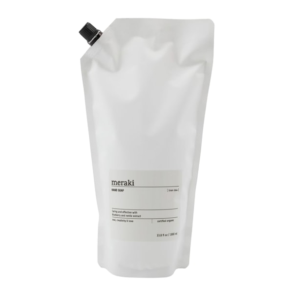 Handtvål refill 1000 ml Linen Dew från Meraki gör att du kan spara på emballaget och fylla din tomma flaska med denna certifierade ekologiska handtvål. Den praktiska 1-liters refillpåsen innehåller en handtvål rik på ekologiska extrakt från blåbär och brännässlor, som bidrar med vårdande mineraliska salter. En fuktbevarande aktiv ingrediens från sockerrovor stärker samtidigt hudbarriären.