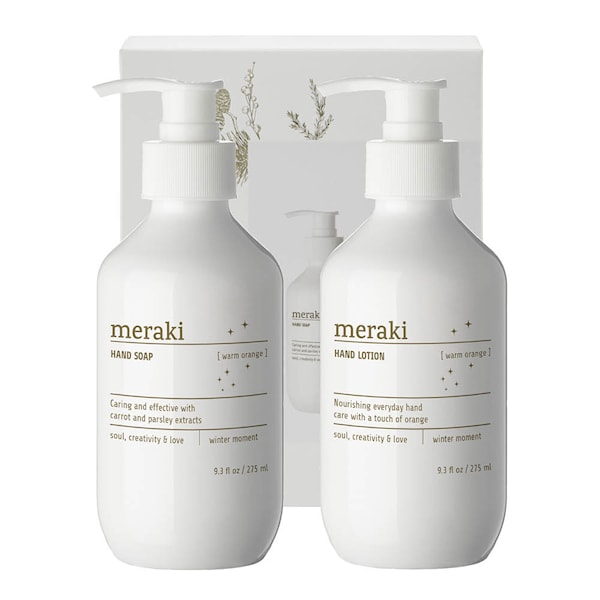 Gåvoset för handvård "Winter Moment" med doften Warm Orange från Meraki gör vinterdagarna lite varmare och är designat för att skapa lugn och välbefinnande i vardagen. Setet innehåller en omsorgsfullt utvald handkräm och handtvål. Den varma doften är en kombination av frisk citrus och mjuka, kryddiga toner som ger en inbjudande och rogivande känsla.