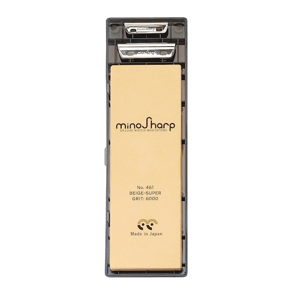 En finkornig sten (6000 i kornstorlek) används när du slipat klart med den medelgrova stenen. Den fina grovleken gör att slipstenen är lämplig för att slipa bort råeggen samt för att polera kniven. Stenen levereras med två olika slipfixturer som hjälper dig att slipa i rätt vinkel.