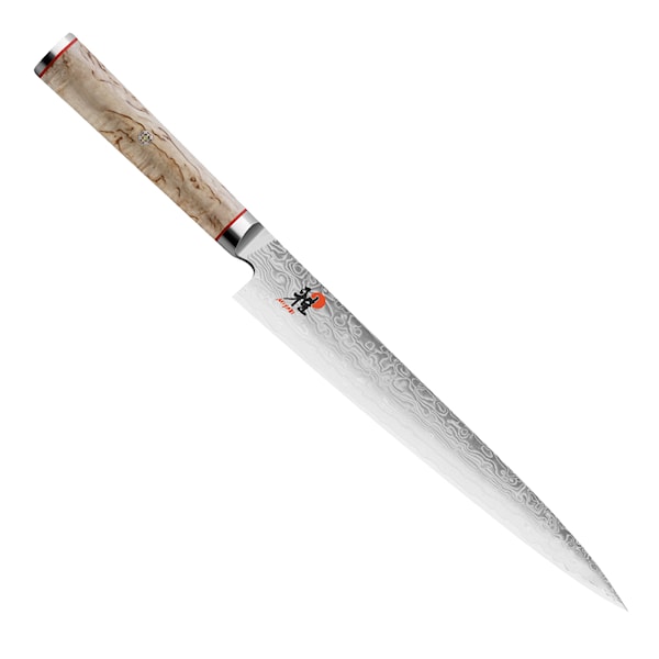 Miyabi Birch serien har en kärna av MC63 Micro Carbide pulverstål, CRYODUR®, som i själva verket är förädlat SG2 stål härdat till en hårdhet av ca. 63 HRC. Bladet är täckt med rostfritt stål i vacker floristisk damaskdesign. Slipvinkel är 19°, eggen är slipad enligt Honbazuke metoden och handtaget är traditionellt D-format och gjort av masurbjörk från finska Lappland. Alla Miyabi knivar är tillverkade i Seki, Japan, med urgamla japanska traditionella metoder och modern tysk ingenjörs- och fabrikstradition. Miyabi ger dig exceptionellt vassa knivar med en raffinerad skönhet, finess och kvalitét som dessutom lämnar en livstidgaranti på material och produktionsfel.