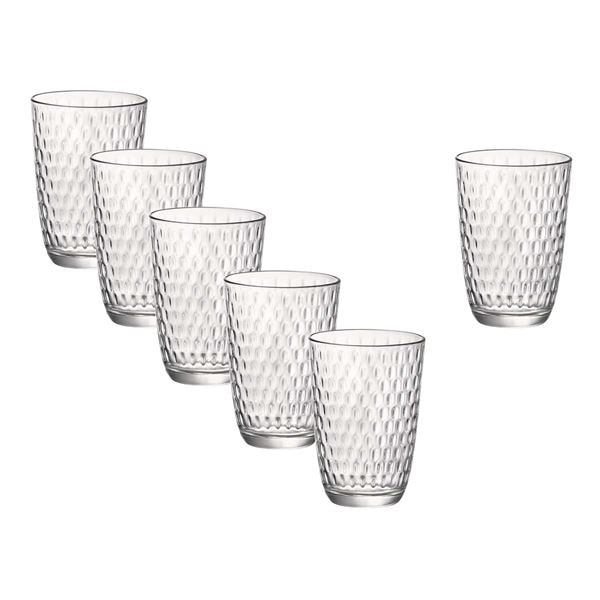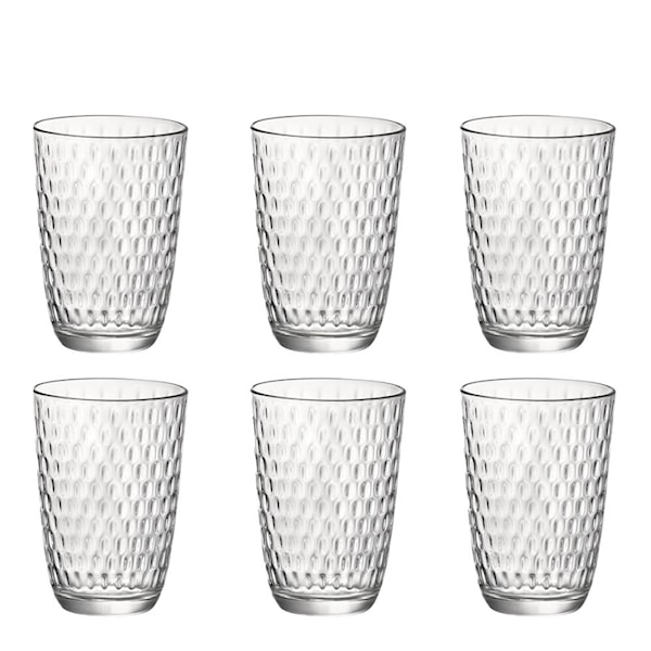 Vackra vardagsglas i robust kvalitet som tål daglig användning. Den konvexa strukturen på insidan skapar ett dekorativt och levande uttryck, samtidigt som glasets form gör det bekvämt att hålla i. Glasen är stapelbara och tar därmed minimalt med plats i köksskåpet. Mekaniskt tillverkade i Italien med fokus på både funktion och design.
