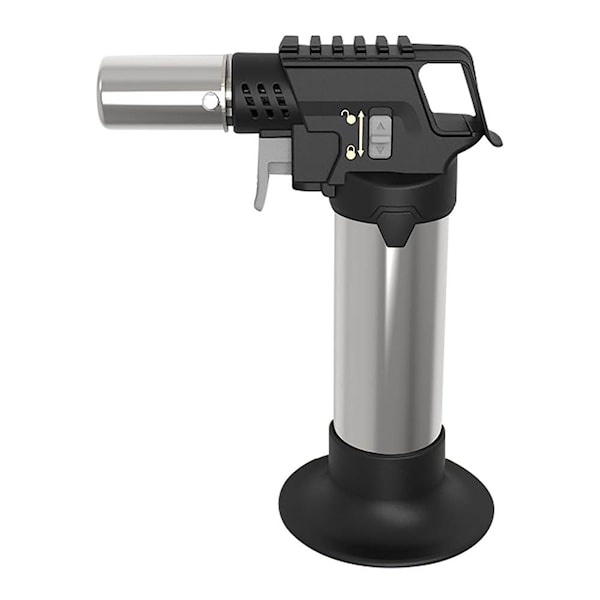 Flamberaren används för karamellisering och ytbehandling av livsmedel. Den fylls med butangas (tändargas) som köps separat och kan återfyllas vid behov. Produkten har justerbar låga, säkerhetslås och flamskydd som bidrar till säker hantering. Låsfunktionen möjliggör kontinuerlig låga.