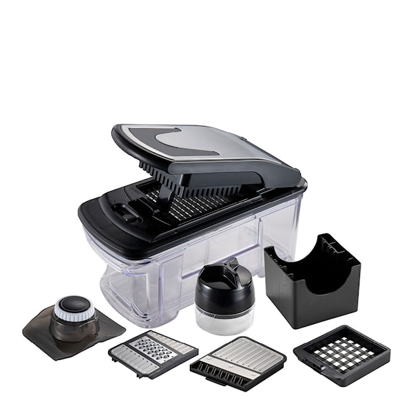 Grönsakshackaren har flera justerbara inställningar som låter dig välja tjockleken på skivor och strimlor beroende på vad du ska tillaga. Den medföljande förvaringslådan gör att du enkelt kan förvara de skurna råvarorna i kylskåpet, vilket underlättar matlagningen ytterligare. Setet innehåller en stav, ett grovt järn, en mandolin/skivskärare, en fin-kutter, en grov kutter och en julienne-strimlare.