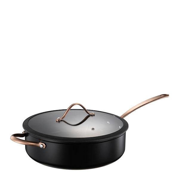 Black Copper Stekpanna 28 cm från Modern House, är en serie kastruller och stekpannor i belagd aluminium med kopparfärgade handtag. Serien är tjockbottnad för jämn värmefördelning och har KFCC G7 keramiskt belägg.