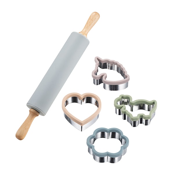 Chic Kids bakset 5 delar från Modern House innehåller allt som behövs för lekfullt bak – en kavel i bokträ och fyra söta bakformar i olika utformningar och mjuka färger.