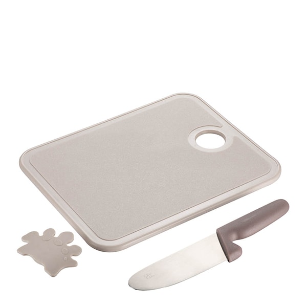 Chic Kids 3-delars redskapsset i kräm och brunt från Modern House är skapat för små kockar med stor entusiasm. Barnet får en egen säker skärbräda och kniv med rundad egg och handskydd.