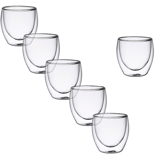 Lundi mugg 6-pack, 25 cl, från Modern House är det perfekta valet för dig som söker en elegant och funktionell glasmugg. Dessa dubbelväggiga muggar i klassisk design är tillverkade av högkvalitativt borosilikatglas, vilket gör dem lämpade för alla typer av drycker – från uppfriskande iskaffe till rykande hett te (upp till 120°C). De dubbla väggarna ger inte bara en vacker visuell effekt, utan skyddar också dina händer från värmen och förhindrar att fuktig kondens bildas på utsidan.