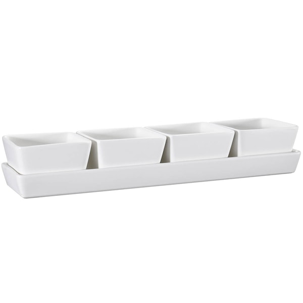 Nor tapasfat med fyra vita skålar från Modern House erbjuder ett stilfullt sätt att servera tapas och små tilltugg. Det eleganta serveringsfatet samlar fyra glaserade skålar som passar perfekt för att presentera ett urval av rätter. Fatets långa, stilrena design är både praktisk och vacker, vilket gör det lätt att skapa en inbjudande dukning. Fatet kan både användas till servering av olika livsmedel eller som en bricka för de fyra skålarna, beroende på vad som passar bäst för tillfället. Setet ger, med sin mångsidighet, möjlighet till en inbjudande och varierad servering som passar alla tillfällen.