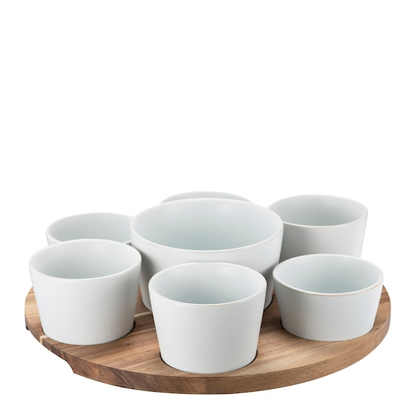 Serveringsbrickan är tillverkad i robust akaciaträ och har urfrästa hål för skålarna samt ett integrerat handtag på undersidan som gör serveringen både smidig och stilfull. Handtaget är en del av designen och bidrar till både praktisk funktion och ett genomtänkt helhetsintryck. Brickan rengörs enkelt med en fuktig trasa, vilket bevarar träets naturliga lyster och kvalitet.