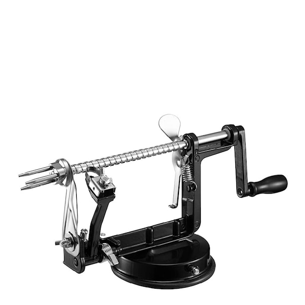 Den robusta kroppen i gjuten aluminium har en emaljerad yta och står säkert med sin sugkoppbas. Handtaget ger trygg hantering, medan det justerbara bladet minimerar svinn. Knivbladen är vassa – hantera med försiktighet. Avtagbara delar gör rengöringen enkel. En köksfavorit för både vardag och fest.