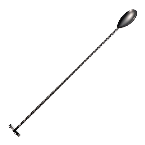 Sontell Smoke barsked med muddlare från Modern House är ett funktionellt redskap i 18/8 rostfritt stål med stilren gun metal-färgad beläggning. Skeden är 30 cm lång och har en tvinnad form som gör den idealisk för användning i shaker och longdrinkglas. I ena änden finns en muddlare som kan användas för att krossa ingredienser som lime och mynta direkt i glaset.