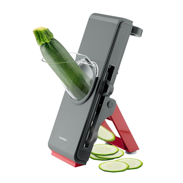 moHA! Vertico vertikal grönsaksskärare i grått kombinerar modern design med praktisk funktionalitet. Den vertikala placeringen gör det enkelt att arbeta säkert, och med ett tryck skivar eller strimlar du utan att komma nära de vassa bladen.