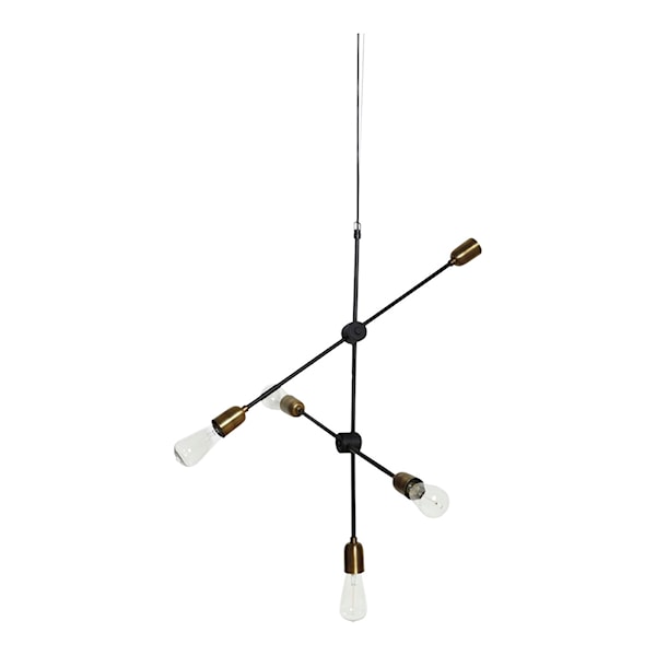 Den vackra Molecular lampan från House Doctor är en nästan skulpturlik lampa som är en praktisk ljuskälla samtidigt som den ger en touch av personlighet till ditt hem. Lampan består av fem mässingssocklar som är fästa vid svartfärgade justerbara stänger. Lampan är en vacker dekoration - både när den är tänd och släckt. Låt den hänga ovanför ditt middagsbord, i ett hörn av vardagsrummet eller använd den som en elegant ljuskälla i hallen. Upphängning med en sladd på 2,5 m ingår. Glödlampor ingår inte.