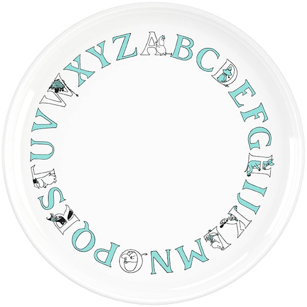 Mindre tallrik med ett Mumininspirerat alfabetsmönster och en diameter på 20 cm från RIG-TIG.