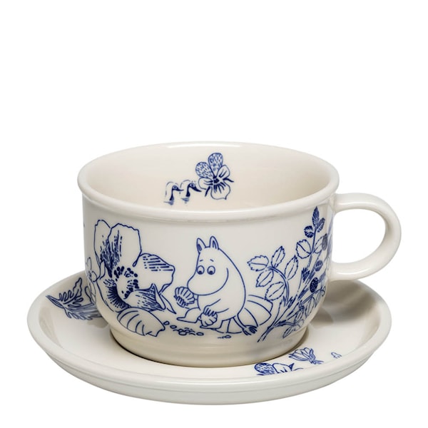 MoominArabia Haru Mumin kopp 30 cl med fat är skapad som en hyllning till Tove Janssons konstnärskap. Den blå och vita kollektionen har hämtat inspiration från de mjuka formerna på Klovharun, ön där hon tillbringade många somrar. Dekoren baseras på kransar som konstnären själv formgav.