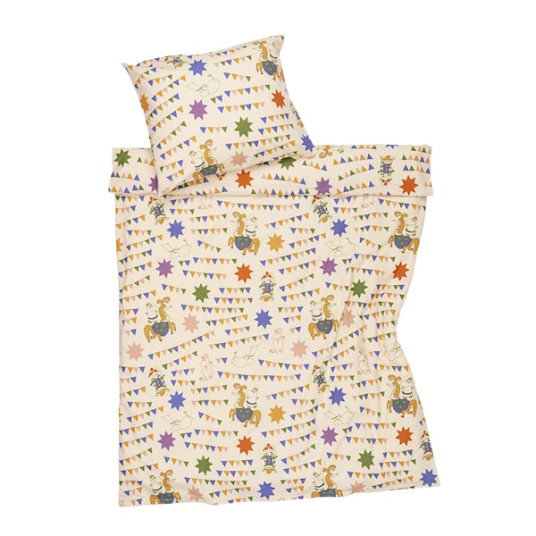 Mumin bäddset 150x210 cm med cirkusmotiv från MoominArabia förvandlar ditt sovrum till en magisk cirkus. Låt Mumintrollet, Snorkfröken och Lilla My roa dig med cirkuskonster, dans och tindrande stjärnor tills ögonlocken går ihop. Med dämpade toner och ett ljuvligt bildspråk inspirerat av Tove och Lars Janssons målarbok från 70-talet, har detta sängklädeset ett tydligt retrouttryck som tillför en nostalgisk charm. Tillverkat av 100 % ekologisk bomull, erbjuder det både komfort och hållbarhet. Perfekt för alla Mumin-fans som vill ha en bit av Mumindalens magi med sig in i drömmarnas värld.