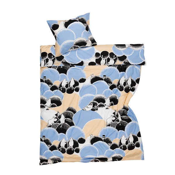 MoominArabia Mumin bäddset 150x210 cm Småsten lyfter fram Mumintrollets äventyrslust i en balanserad färgskala av blått och varmt rött. Mönstret är en visuell tolkning av naturen och den nyfikenhet som genomsyrar Mumin-berättelserna.