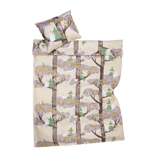 Sängkläderna "Vänner för alltid" från MoominArabia kombinerar en lugn färgpalett med en lekfull design som visualiserar gemenskap och vänskap. Motivet med Mumintrollet, Snusmumriken och Lilla My som klättrar i träd ger ett glatt och fantasifullt inslag till sovrummet.