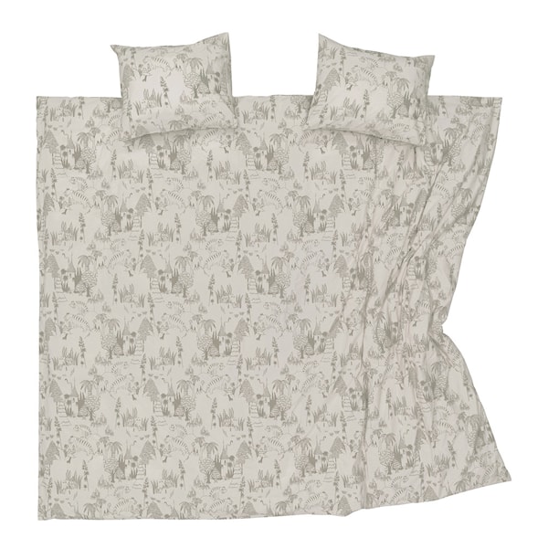 Mumin bäddset 240x210 cm med trädgårdsfestmotiv från MoominArabia bjuder in dig till en natt fylld av äventyr. Vågar du sova med tigrarna? Muminmamman planterar tropiska frön som förvandlar Mumindalen till en frodig djungel. För att göra djungeln komplett släpper Stinky ut djuren från djurparken, och tigrarna känner sig precis som hemma bland den täta vegetationen. Tillverkat av 100 % ekologisk mjuk bomull, erbjuder detta bäddset både komfort och hållbarhet. Låt ditt sovrum förvandlas till en exotisk oas och dröm dig bort till Mumindalens magiska värld. Perfekt för alla Mumin-fans som vill ha en touch av tropiskt äventyr i sitt hem.