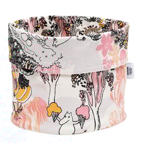 Mumin förvaringskorg från MoominArabia förenar funktion och design i en charmig rosa ton. Mönstret är inspirerat av "Småtrollen och den stora översvämningen", den första Muminberättelsen, och ger en känsla av saga i vardagen.