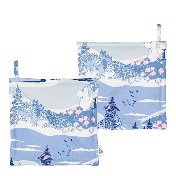 Härligt set med 2 grytlappar (22x22 cm) från Moomin Arabia och kollektionen "Äntligen hemma" tar Mumintrollets värld rakt in i köket. Illustrationen visar återföreningen med familjen – ett ögonblick fyllt av glädje och tillhörighet.