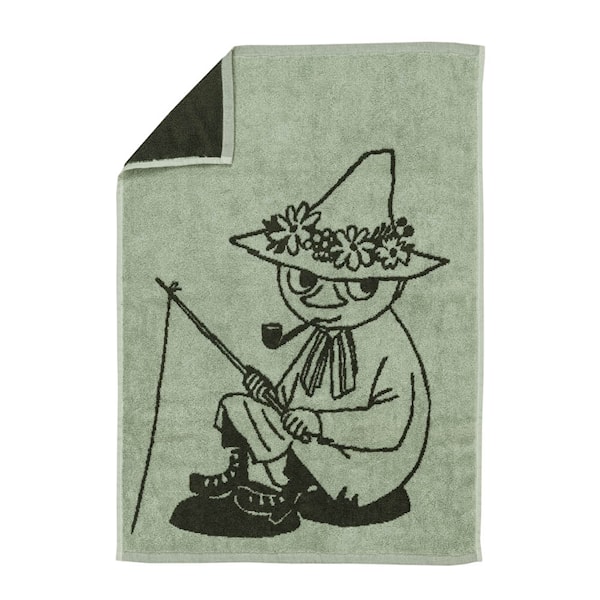 MoominArabia handduk 50x70 cm, Snusmumriken grön är tillverkad i ekologisk, GOTS-certifierad bomull och pryds av den fria och eftertänksamma Snusmumriken – en favorit bland både barn och vuxna.