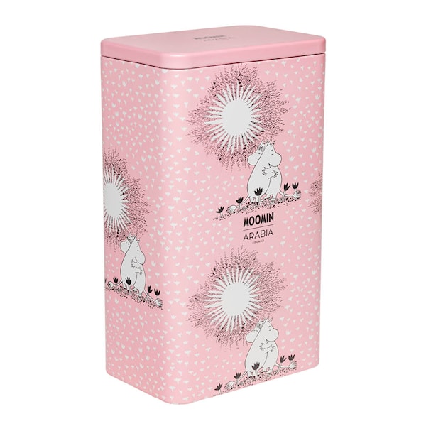 Rosa Mumin kaffeburk från Arabia med det vackra Kärlek-mönstret – en illustration av Mumintrollet och Snorkfröken i en kärleksfull omfamning. Motivet uttrycker både vänskap och romantik och ger kaffestunden en poetisk känsla.