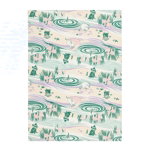 Motivet skildrar Mumintrollens sommaräventyr, där Snorkfröken njuter av solen, Mumintrollet söker snäckskal och Lilla My tar ett dopp i havet. Handduken är lika perfekt att ha med sig på stranden som hemma i köket för att skapa en känsla av lekfullhet och värme.