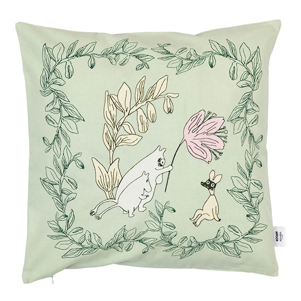 Mumin kuddfodral i grönt från MoominArabia förenar funktion, form och berättande på ett subtilt sätt.