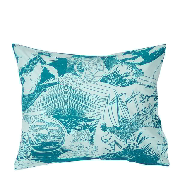 MoominArabia Mumin örngott 50x60 cm Segling är ett piggt och färgstarkt tillskott i sovrummet. Mönstret speglar Muminpappans frihetslängtan och hans äventyrliga sinne, med maritima inslag och klara färger som livar upp sängen.