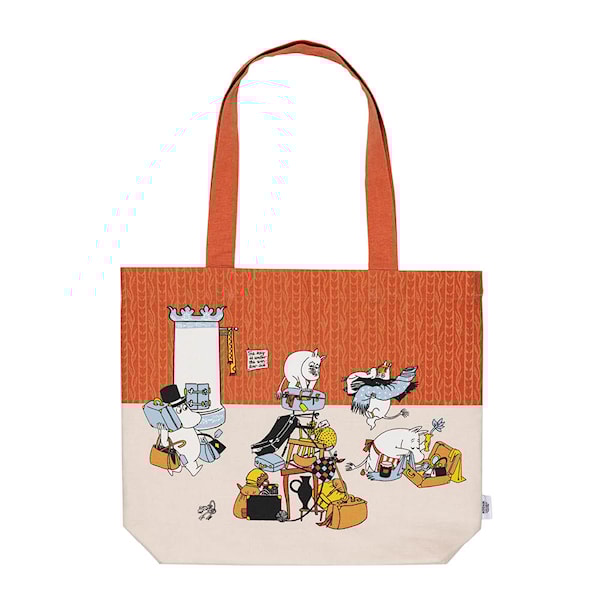 MoominArabia Mumin tygpåse 45x35 cm Redo för semester fångar den där förväntansfulla känslan precis innan resan börjar. Motivet visar Muminfamiljen mitt i packningen, när sommarens äventyr väntar runt hörnet.