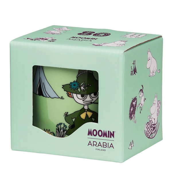 Muminmugg 30 cl Snusmumriken 80 år med presentask är en limiterad jubileumsupplaga från Moomin Arabia – ett samlarobjekt som hyllar Mumintrollens 80-årsjubileum. Den gröna muggen visar Snusmumriken ständigt på vandring, alltid med tid att tänka och spela en melodi, i sin typiska fria anda.