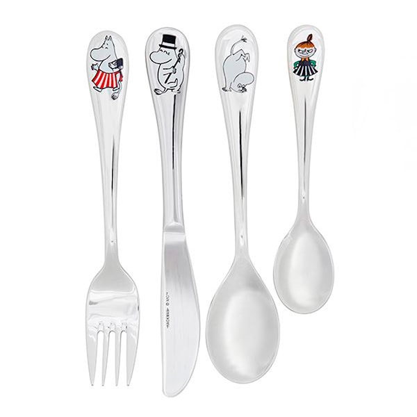 Besticken är tillverkade i rostfritt stål och med Muminfamiljen tryckta på varje del. Barnbestickens storlek och utformning gör att de är lätta att greppa även för de minsta händerna.