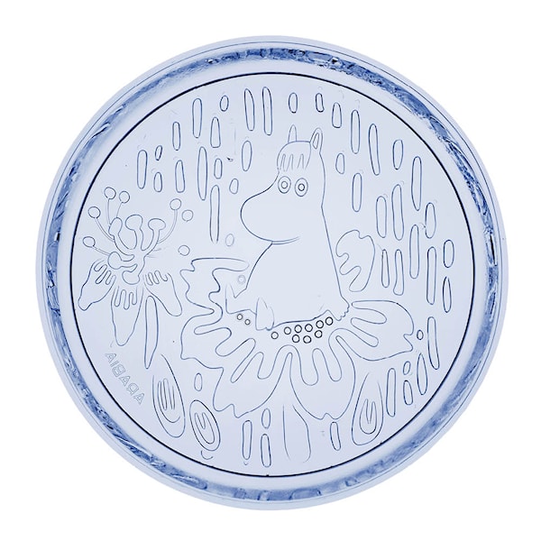 Denna glastallrik från Moomin Arabia, 15,5 cm, fångar stämningen från Tove Janssons "Trollkarlens hatt" med en detaljrik textur i Aqua.