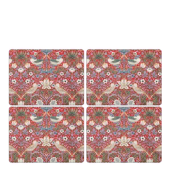 Färgsprakande bordstabletter från Pimpernel i samarbete med Morris & Co. Motivet Strawberry Thief kommer tillföra det lilla extra till dukningen och föreställer en jordgubbssugen fågel bland blommor och blad.