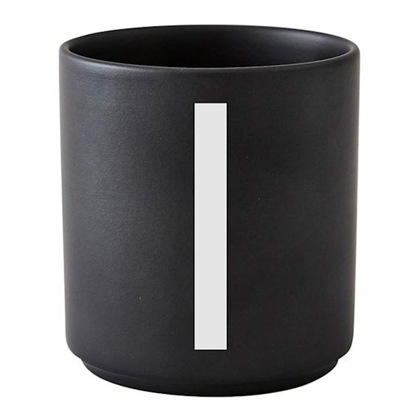 Stilrena svarta muggar tillverkade av glaserat benporslin med vitt tryck. Välj mellan alfabetets alla bokstäver från A till Z.