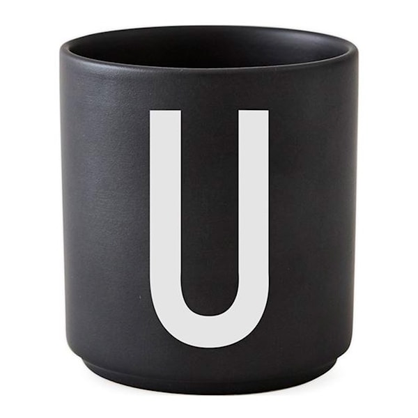Stilrena svarta muggar tillverkade av glaserat benporslin med vitt tryck. Välj mellan alfabetets alla bokstäver från A till Z.